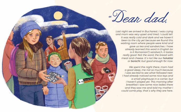Cu toate acestea, textul nu este unul formal, de tip raport, ci reprezintă vocea copiilor ucraineni care le povestesc taților (rămași să lupte) despre noua lor viață și cum au fost primiți în România. Textele s-au bazat pe mărturii reale ale copiilor refugiați. (Design de Alice Stanciu -Allistration). Broșura a atras atenția în România, dar și în Elveția, unde a inspirat un eveniment de fundraising. Broșura se poate citi aici